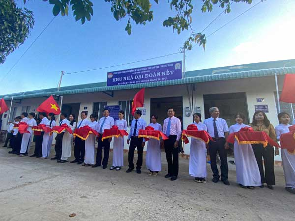 Lãnh đạo Ủy ban MTTQ tỉnh, huyện, Ủy ban nhân dân huyện và ban ngành, đoàn thể xã, lãnh đạo Công ty TNHH MTV Xổ số Kiến thiết An Giang và các mạnh thường quân cắt băng khánh thành khu nhà Đại đoàn kết.
