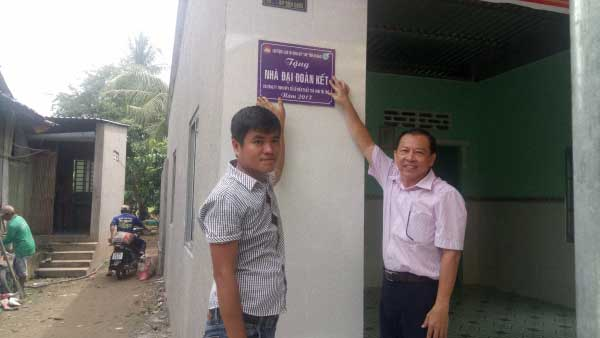Ảnh: Ông Lâm Xuân Tiến – Phó Giám đốc Công ty TNHH MTV Xổ số Kiến thiết Trà Vinh gắn biển nhà cùng hộ gia đình