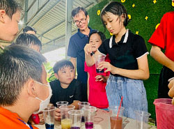 Các cháu thực hành thí nghiệm vui đổi màu hoa đậu biếc