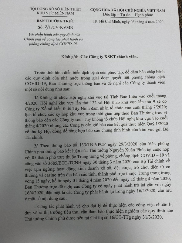 Công văn số 31/CV-KVMN của Ban thường trực Hội đồng xổ số kiến thiết khu vực Miền Nam về việc chấp hành các quy định của Chính phủ về công tác phát hành và phòng chống covid-19