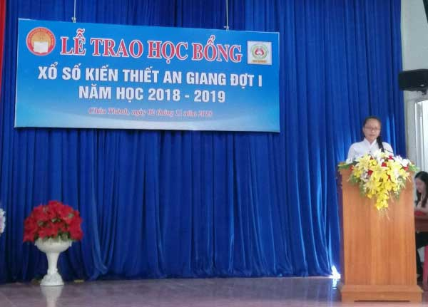 Đại diện phụ huynh học sinh phát biểu cảm nghĩ, đại diện các em học sinh nhận học bổng lên phát biểu cảm tưởng khi nhận được sự quan tâm từ xã hội: cảm ơn Quỹ học bổng xổ số kiến thiết An Giang, cảm ơn Hội khuyến học, nhà trường, thầy cô giáo các em hứa sẽ cố gắng hơn nữa để không phụ lòng mọi người đã quan tâm.