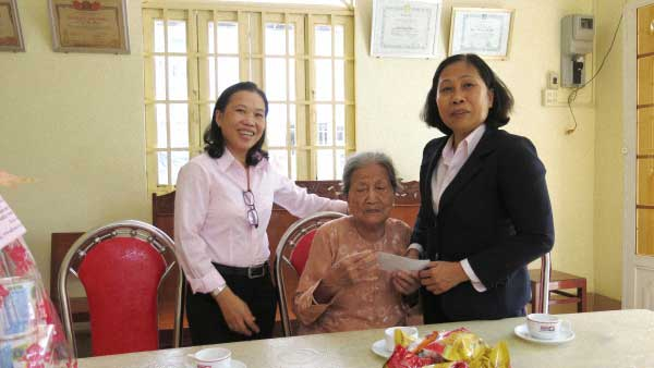Bà Lê Thị Cẩn- Chủ tịch Công đoàn công ty đai diện tặng quà và chụp ảnh lưu niệm cùng Mẹ VNAH Phạm Thị Nở.